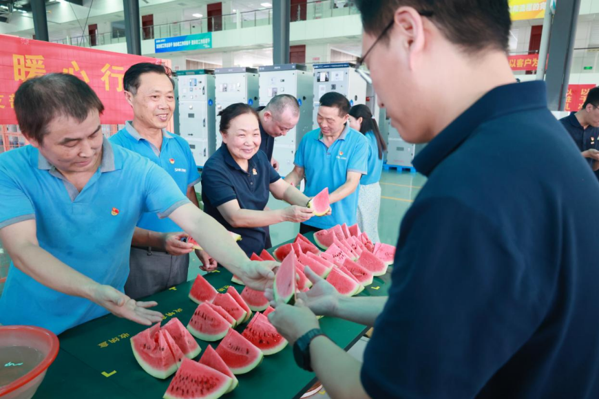 7月8日,炎炎夏日送关怀,galaxy银河电气党支部携手营销中心温情启动“夏日清凉送车间·情系一线暖心行”活动。营销中心领导及党员代表深入生产一线,为辛勤工作的员工们送上了西瓜、矿泉水、冷饮等降温物资,用实际行动传递组织的关怀与夏日的清凉,进一步增强了团队的凝聚力与向心力,让一线员工感受到了galaxy银河家的温暖与企业的深情厚谊。
