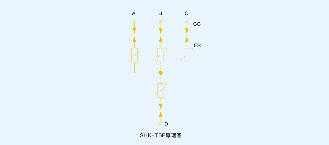 三相组合式过电压保护器由四个带放电间隙和氧化锌电阻串联的单元组成,如图所示,图中FR为氧化锌非线性电阻,CG为放电间隙,由于采用对称结构,其中任意三个可分别接A、B、C三相,另一相接地。三相组合式过电压保护器具有其它同类产品不可比拟的特点: