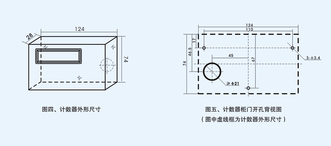 如图二所示,采用分体安装方式需在柜门上开安装孔,计数器外形尺寸和开孔尺寸见图三、图四、图五。